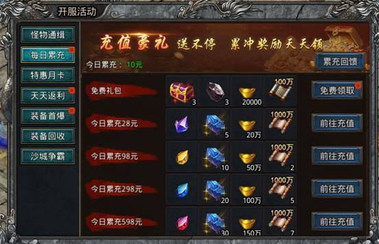 当日充值累计一定金额可获取累充礼包,累充达到一定额度更有回馈好礼相送。累充礼包有免费礼包,28元,98元,298元,598元,998元的档位礼包。