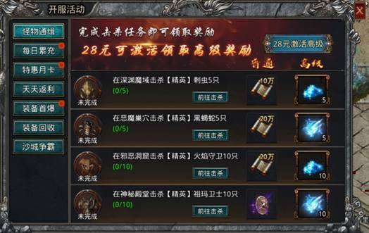 通过挑战击杀逐步变强的怪物,完成任务后,可获得经验卷、装备等大量奖励,激活高级奖励之后还可获得额外材料奖励。