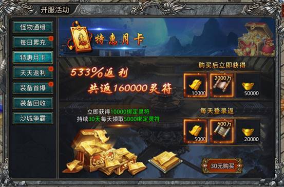 超值月卡购买立得海量灵符、经验卷和元宝,每日登录都可获得当日礼包,合计533%的返利,不容错过。
