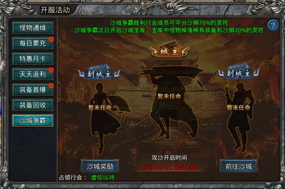 开服第5天晚上20:00-21:00将首次开启攻沙活动,此后每周周六20:00-21:00开启;进攻方需攻破城门,破坏皇宫宫墙,才可进入皇宫;当皇宫只有一个行会的玩家时,即占领皇宫成功(攻城开启10分钟后,才可变换占领方,请勇士稍安勿躁);活动结束时,占领皇宫的行会就是沙巴克霸主行会,将获得丰厚的道具和称号奖励(开服前5次攻沙有额外奖励);活动结束后,按积分进行排名,根据排名发放个人奖励。
