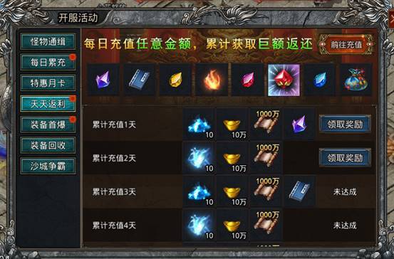 当日充值任意金额可获取累充礼包,礼包包含大量高额经验卷、元宝、纹章素材,签到越多越划算,更有极品素材等你领取。